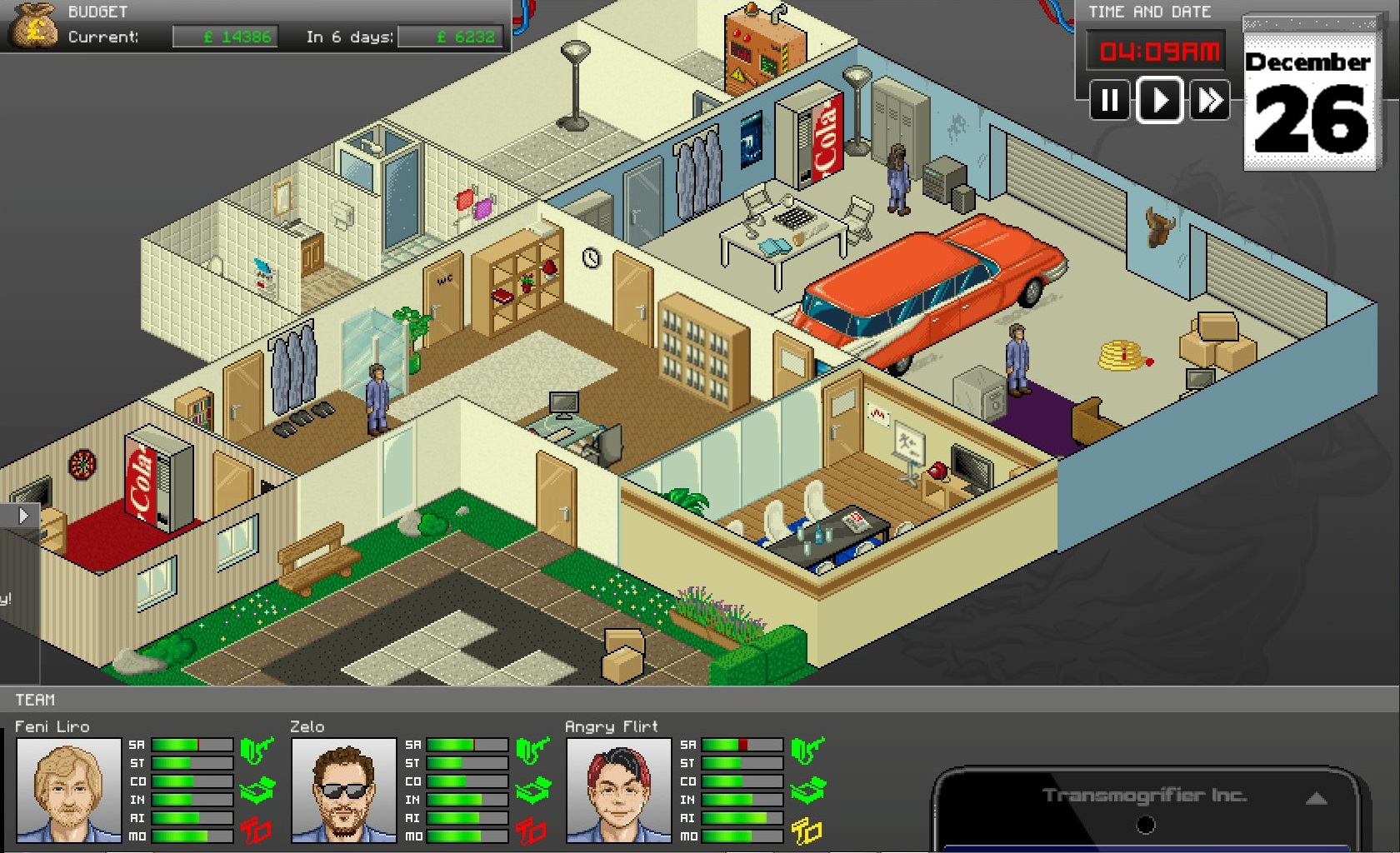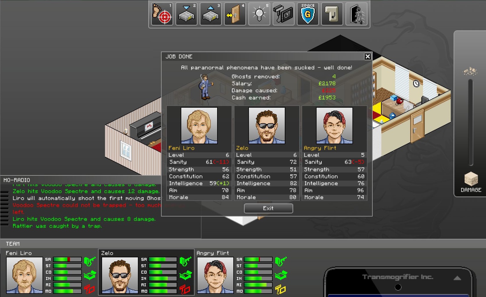 The game draws obvious inspiration from the 1990s, arguably a golden age of PC games when independent development companies and mid-list publishers still roamed the Earth. It’s evident in GhostControl’s visuals, with both of its layers of gameplay featuring a sprite-based isometric perspective and hand-drawn pixel art. It’s evident in the game’s mechanical lineage, too, with its hybrid of real-time strategic overworld and turn-based tactical combat most obviously recalling UFO: Enemy Unknown and its sequels alongside other titles such as Imperium Galactica. Its further evident in its desire to be a easy-to-play, difficult-to-master comedic business strategy game in the vein of Bullfrog titles like Theme Hospital.
