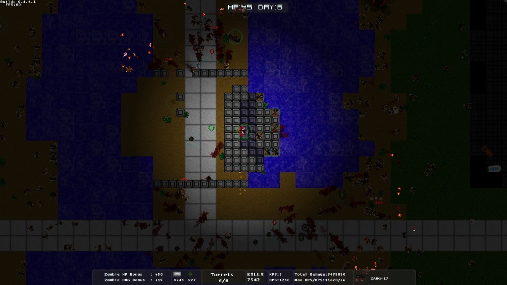 I found my greatest success by building my base alongside a lake – zombies can’t cross water, which automatically reduces their routes of ingress significantly – and spreading out three pairs of turrets, each with one shotgun and one explosive turret. Great crowd control. In the end that iteration of my hopes and dreams died because I got cocky on a night when every zombie was a fire-belcher. (Don’t question the enemy types. They do not question you.)