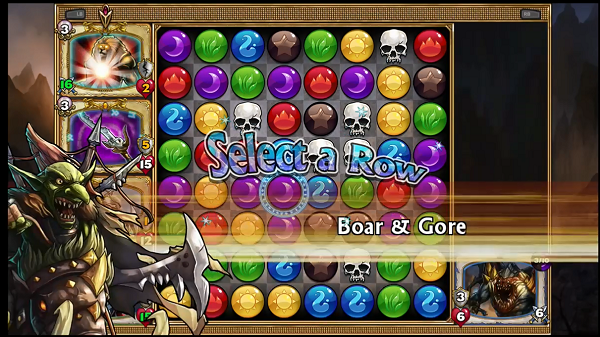 The Boar Rider is the most evil of the cards: it takes purple and green gems to use its “Boar & Gore†skill. This chops through a whole row of gems, does damage to the first enemy in line and automatically allows for an extra turn regardless of what gems drop. The destruction of the row can allow you to set up a handy line of four that you can then use in the next turn.